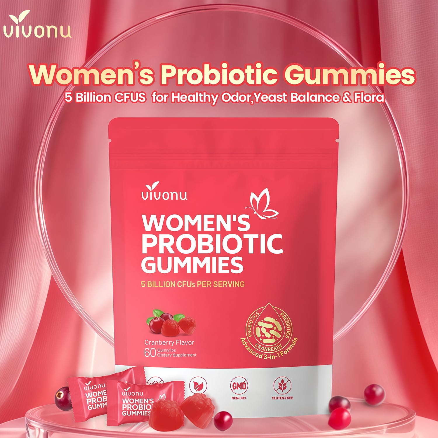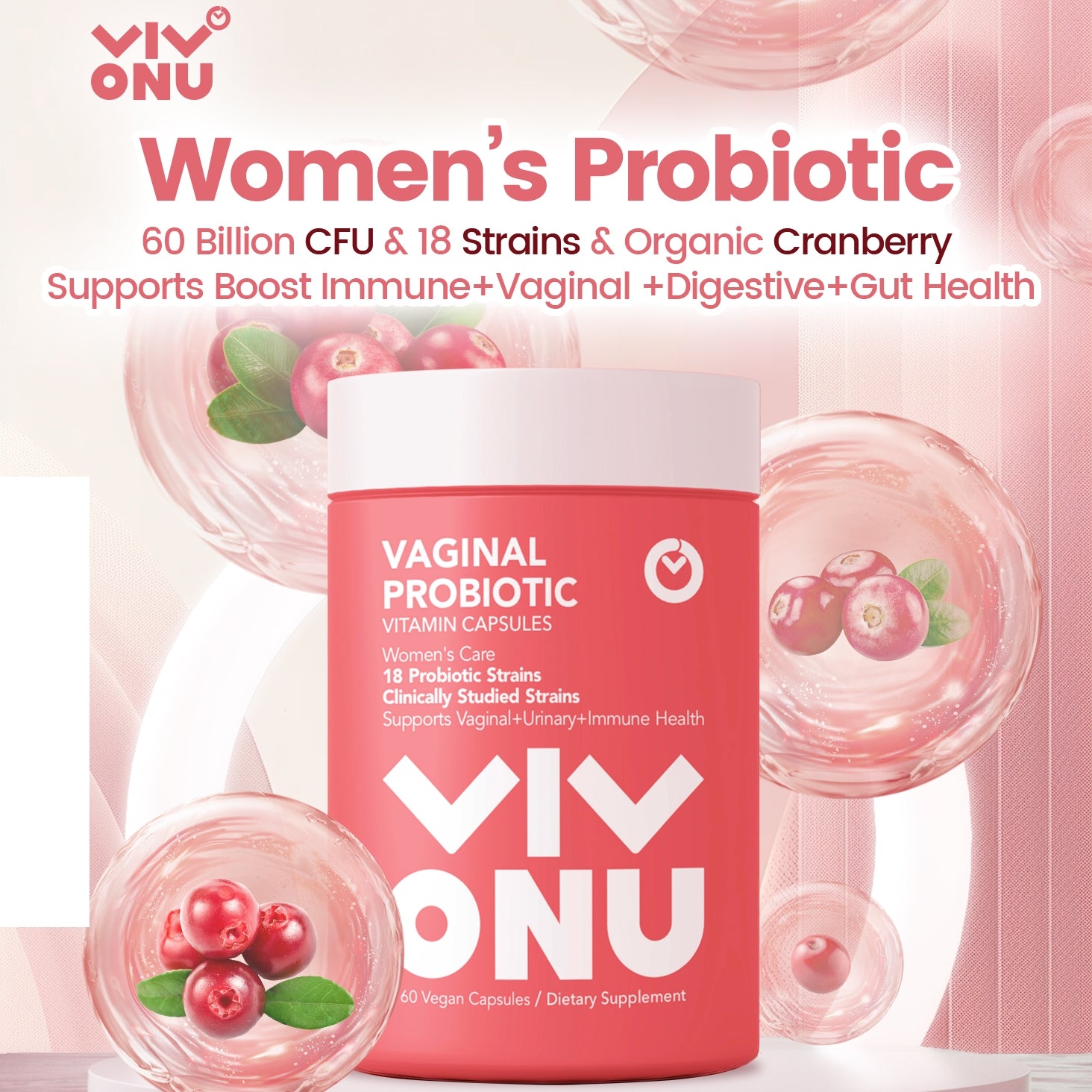 Complete Feminine Support. A precision blend of 60 Billion CFU, Prebiotics, and Organic Cranberry to balance your body daily.